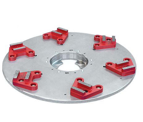 Der Schleifteller besteht aus einem Basisteller aus Edelstahl, der mit sechs roten Diamant-Schleifsegmenten bestückt ist.